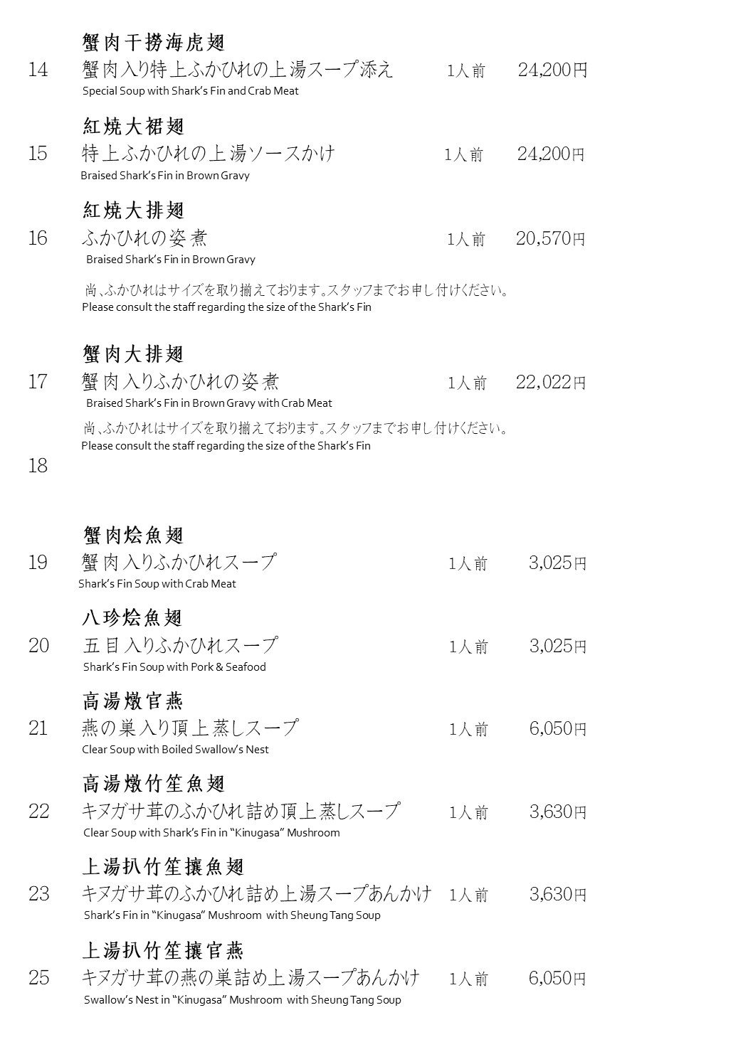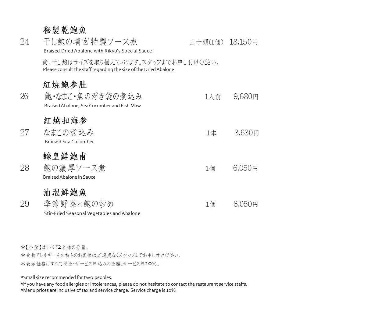 ふかひれ・燕・鮑・なまこメニュー