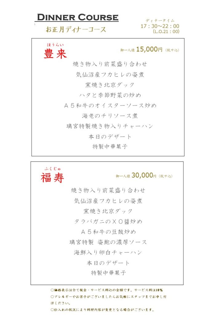 赤坂本店 お正月コース、アラカルトのご案内