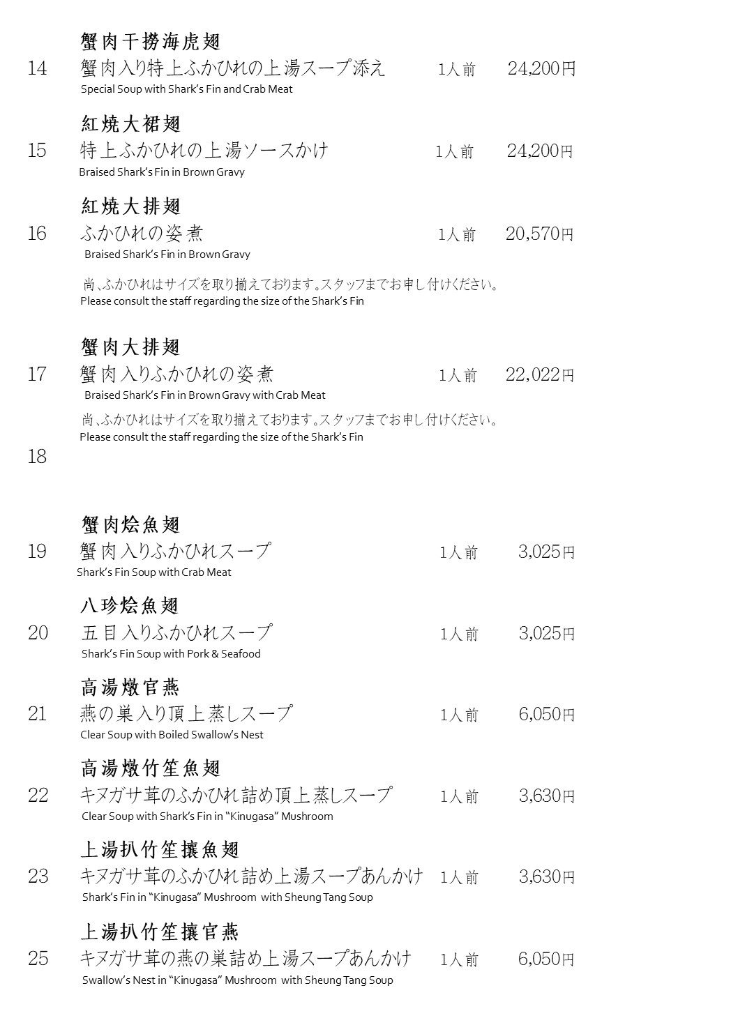 ふかひれ・燕・鮑・なまこメニュー